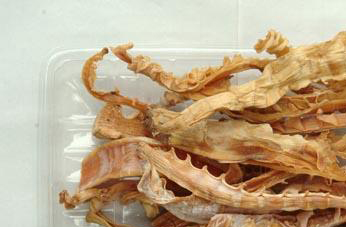 质量优劣鉴别首先看色泽,如呈黄白色或棕黄色,具有光泽的为上品,色泽暗黄的为中品,色泽酱褐的为下品。其次看笋体,短粗,体态肥厚,笋节紧密,纹路浅细,质地嫩脆,长度在30厘米以下的为上品,长度超过30厘米,根部就显得大而老,纤维就多而粗,笋节亦长,质地就老。当笋干含水量在14%以下,手握笋干折之即断,并有响声的,说明湿度适中;如果折而不断,或折断无脆声的,说明笋干水分大。有些笋干由于水分较大,在存放期间,容易长出大片白霉,有的是虫蛀洞眼,则品质差。