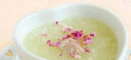 2. 粳米淘洗干净,用冷水浸泡半小时,捞出,沥干水分。 3. 锅中加入约1000毫升冷水,将粳米放入先用旺火烧沸,然后用小火熬煮成粥。 4. 粥内放入玫瑰花瓣、樱桃、白糖,再煮5分钟,即可盛起食用。粳米:粳米能提高人体免疫功能,促进血液循环,从而减少高血压的机会;粳米能预防糖尿病、脚气病、老年斑和便秘等疾病;粳米米糠层的粗纤维分子,有助胃肠蠕动,对胃病、便秘、痔疮等疗效很好。