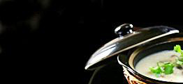 米: 小火干炒至微黃备用(干炒不放油, 此作用使粥吃起来有口感,粥水清而不濁).光鸡下沸水煮大约三十分钟剛熟(不要煮太老),捞出折骨只要肉,肉用手撕成条备用(口感更佳).鸡骨与鸡皮再放回鳮湯裡再加一大把青葱煮沸,再放炒过的米煮滚转開小火还要轻轻不停的搅拌免得底会糊,煮大约一个半小时至米完全开花,再下盐,糖,味精调味即成粥底.粥底先装碗,加红油,干葱,葱絲,洋葱絲,香菜絲,红辣椒最後放鳮肉.开吃啰!又香又辣又甜的鳮粥,肉质清甜嫩滑一流口感,吃时可放些柠檬汁更添加鸡粥的清香味,也可配些椰菜丝与香菜減少油腻与增加口感….如加个”老”油條会更妙。