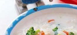 胡萝卜,青菜,蒸熟肉末,粥,适量高汤,熬熟植物油