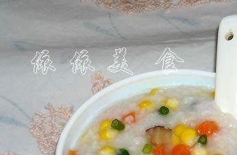 2. 白粥煮好后放入以上材料,继续煮5分钟,加盐,鸡粉调味即可
