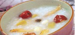 3. 取一深锅,加入12杯水,以大火煮开后转小火,加入洗净的米及作法1的玉竹续煮50分钟,再放作法2的鸡肉片煮10分钟后调味即可。