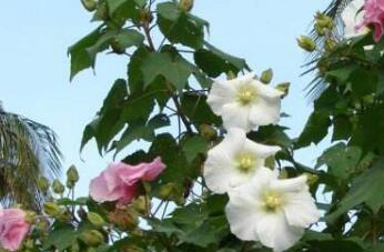 木芙蓉属于落叶灌木或者小乔木,这种植物的叶片、花枝以及花梗上都有细小的绒毛,它的花生于枝头顶部的叶腑中,初开时为白色或者浅粉色,后来会慢慢的变成深红色,而且花瓣接近于圆形,花形浓郁,花姿诱人。