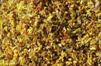 2、准备好的干桂花,要挑拣一下,去掉里面的残花和花梗以及树叶,再把它用清水洗净,把处理好的干桂花放在锅中加清水煮制,煮开以后加入适量的鱼胶粉和白糖调匀。