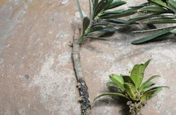 1、剪下的枝条: 剪取10公分的嫩枝(注意,嫩枝是一年生的半木质化的枝条,下面必须带有明显的枝节);
