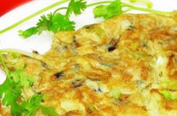 3、平底锅中放食用油,加热以后把蛋液倒入,煎到两面金黄然后取出装盘,香气诱人的芙蓉花煎饼也就做好可以食用了。