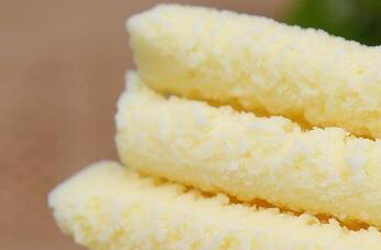2、在加热过程中会发现牛奶中的蛋白结晶,而且不会再出现其他变货,这时乳清的颜色也会变清,可以关火,让它降温,在这个过程中要准备一块干净的纱布,把煮好的牛奶放到纱布中过滤,把水分去掉,得到的奶酪放在干净的模具中压平,然后存入冰箱的冷藏室,五六个小时以后他就能成型,取出以后切成块或者片状就能食用。