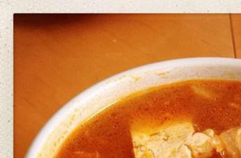 第五步:稍稍用勺子翻搅豆腐,让豆腐和锅中的汤汁融合,不要太大力防止豆腐破损。