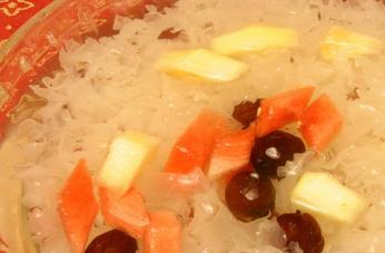材料:白木耳(银耳)5克,应时水果适量。