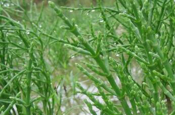 海蓬子是藜科植物盐角草,是一种生命力特别强,经常长在海滩和盐碱地的绿色植物,这种植物有梗无呼,长长期约二百二十天,其中有六十天左右能保持青嫩鲜绿的枝茎,海蓬子中含有丰富的维生素C,还有多种氨基酸,它的种子中还有大量的油脂,提纯以后能食用也能入药。