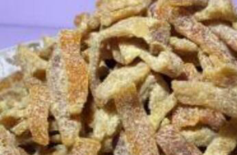 4、加入准备好的白糖,煮至一会儿,让白糖化开,在把应该由得陈琪放到锅中浸泡一夜,在第二天把陈皮捞出来以后,放在阳光下晒制,晒到半干以后继续放倒料汁中浸泡,直到把所有料汁吸收干净,再把陈皮晾到半干。