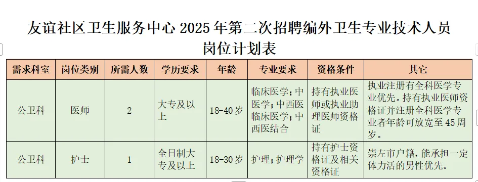 2025广西崇左市江州区友谊社区卫生服务中心第二次招聘编外聘用卫生专业技术人员3人公告已发布,医药人才网为大家收集整理事业单位卫生系统招聘信息,提供相关备考电子版资料和辅导课程。更多卫生人才招聘信息,可点击广西卫生人才招聘栏目。