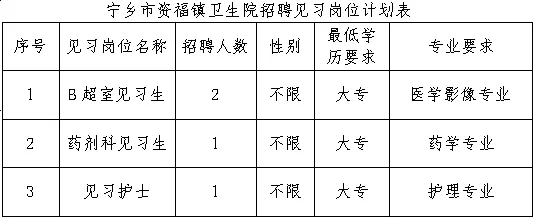 宁乡市资福镇卫生院是经宁乡市人社局审核认定的“湖南省长沙市高校毕业生就业见习基地”,现根据医院工作需要,特面向广大高校毕业生公开招聘见习生4人,具体公告如下: