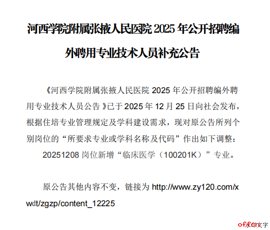 2025年河西学院附属张掖人民医院招聘编外聘用专业技术人员补充公告已发布,医药人才网为大家收集整理事业单位卫生系统招聘信息,提供相关备考电子版资料和辅导课程。更多卫生人才招聘信息,可点击甘肃卫生人才招聘栏目。