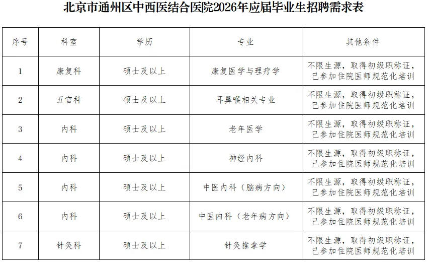 北京市通州区中西医结合医院2026年毕业生招聘公告已发布,医药人才网为大家收集整理事业单位卫生系统招聘信息,提供相关备考电子版资料和辅导课程。更多卫生人才招聘信息,可点击北京卫生人才招聘栏目。