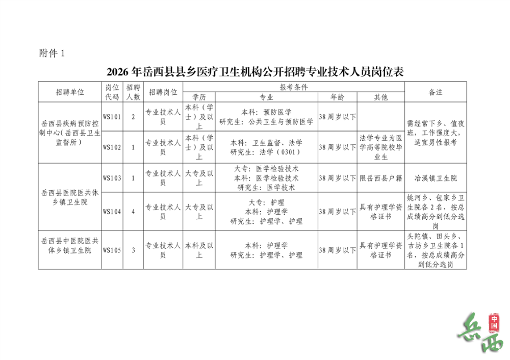 附件1:2026年岳西县县乡医疗卫生机构公开招聘专业技术人员岗位表.docx