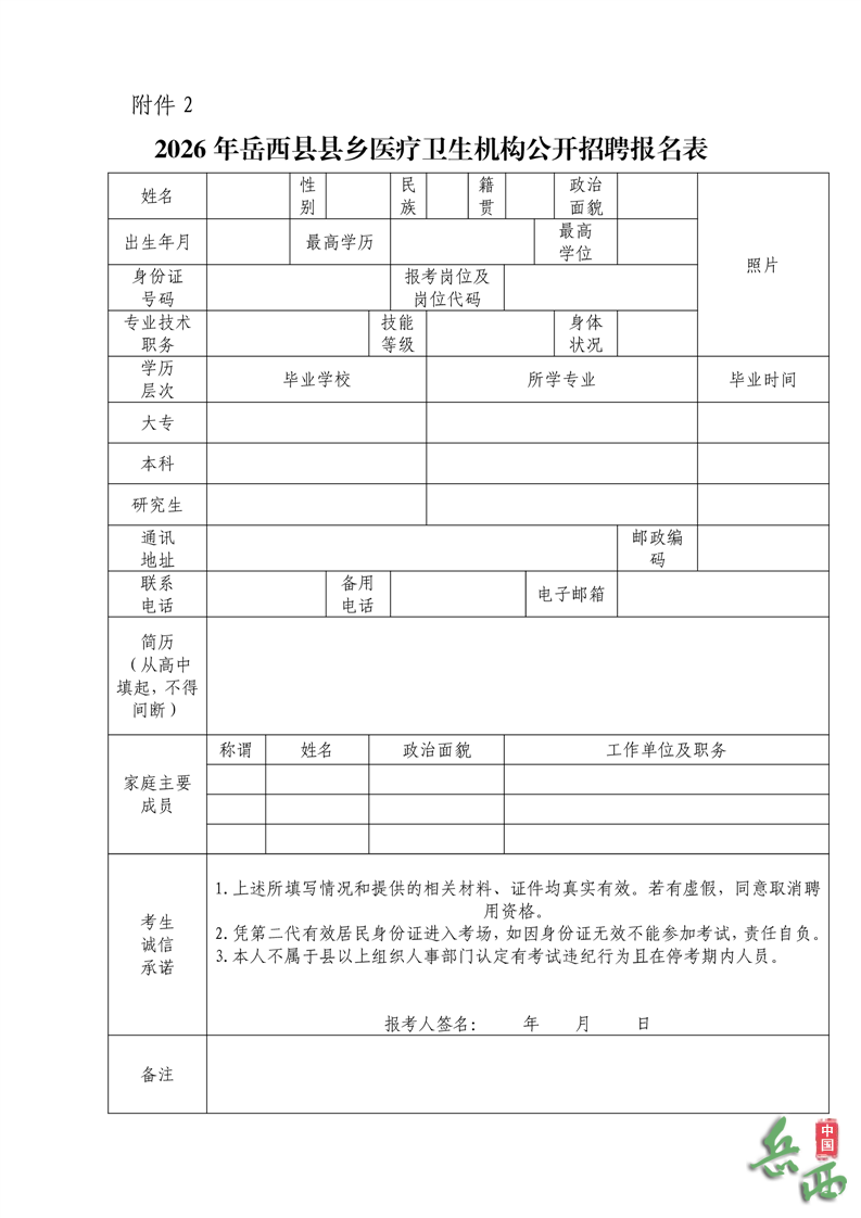 附件2:2026年岳西县县乡医疗卫生机构公开招聘报名表.docx